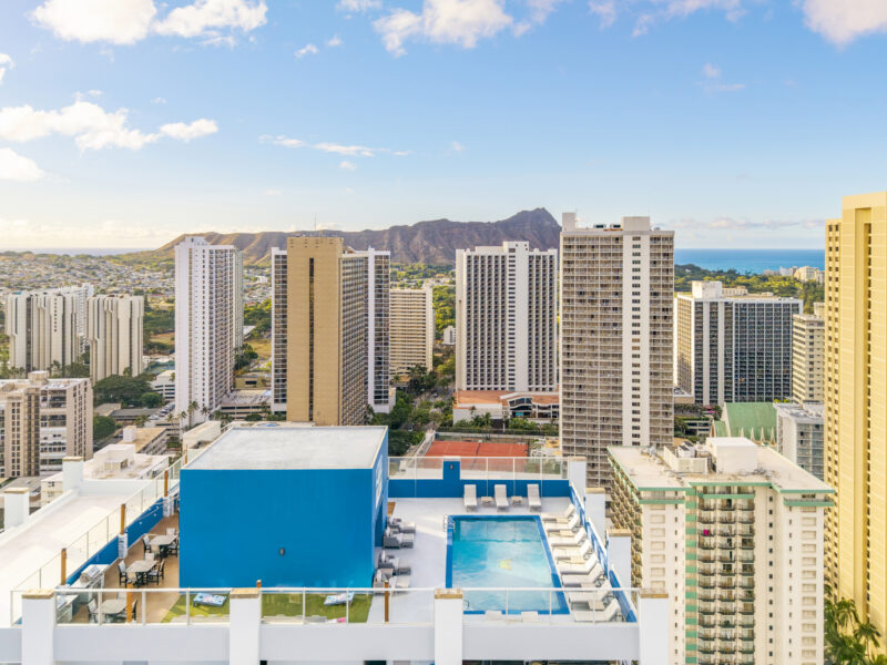 Take in breathtaking Waikiki, Diamond Head, and Pacific Ocean views from our rooftop oasis. Lounge by the pool, soak in the whirlpool spa, or enjoy a BBQ in the picnic area. Try lawn games or unwind in the sauna for a refreshing escape. Our rooftop is the perfect spot to relax, socialize, and enjoy island living.